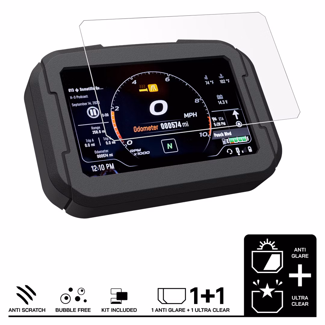 This Harley Davidson 1250 Pan America 2021 motorcycle kit features a high-quality anti-scratch material that protects the instrument cluster/dashboard from scratches and marks. The kit includes an Ultra-Clear or Anti-Glare screen protector, both offering scratch resistance and protection, with the Anti-Glare option also reducing glare and reflections.