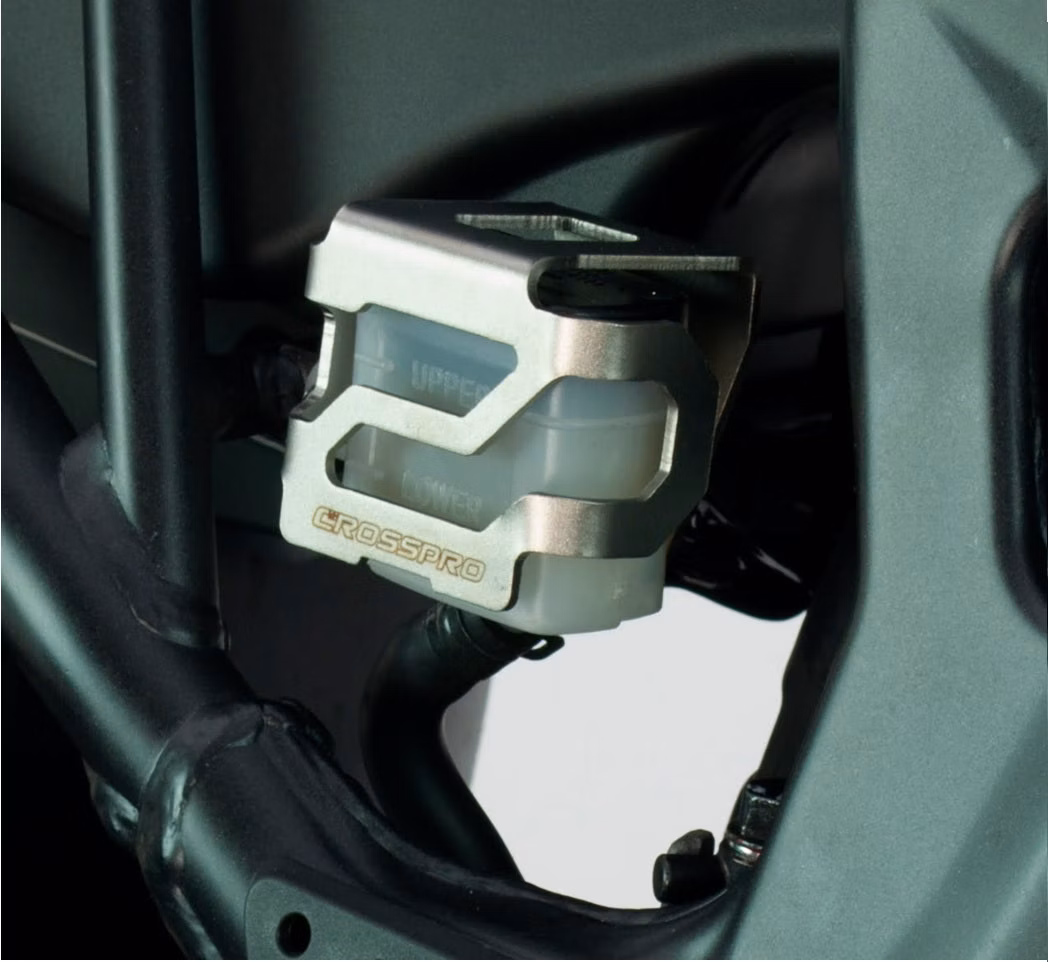 The brake fluid reservoir guard, crafted from laser-cut stainless steel, safeguards against damage and unauthorized access while permitting effortless visual monitoring of the fluid level for simplified maintenance.