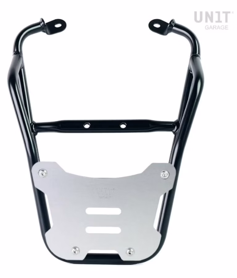 Luggage rack made of steel tube with matt black epoxy powder finish. It completes the rear part and is equipped with handles for the passenger. It is very simply fixed to the motorbike frame on the 4 fixing points provided by Fantic Caballero 125-250-500. Robust and practical, it completes the aesthetics of the motorbike.