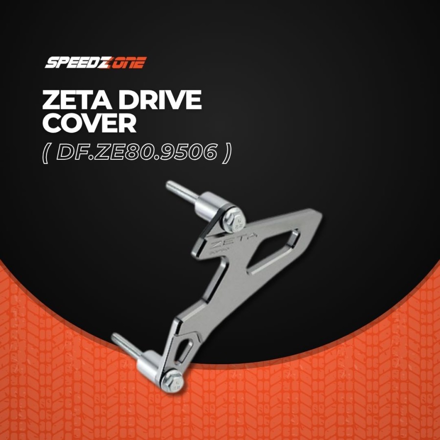 Zeta Drive Cover (ZE80-9506) — CNC-machined aluminum front sprocket guard that protects chain and sprocket from mud and debris, with anodised finish and direct-bolt mounting design.